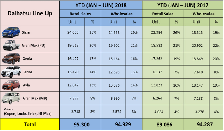 Melihat data penjualan per-model sepanjang Semester I - 2018, penjualan Daihatsu tetap didominasi oleh tiga volume maker yaitu Astra Daihatsu Sigra, Gran Max Pick Up (GM PU), dan D
